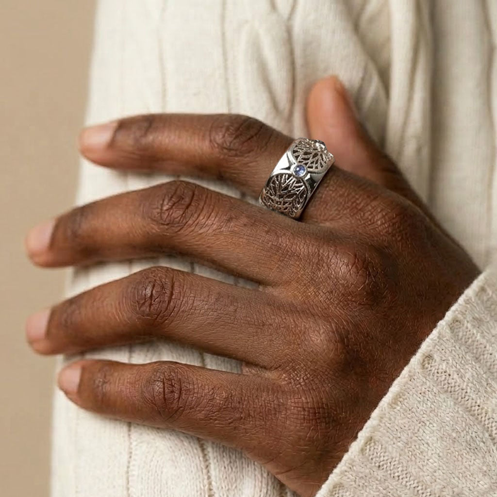 Its bold form is pierced with openwork, like water carving pathways through stone. The pattern ripples with quiet determination, echoing the diverging channels left behind by rivers through the desert. Cabochon sapphires orbit the band like moments of clarity: hard-won, luminous, and deeply earned.